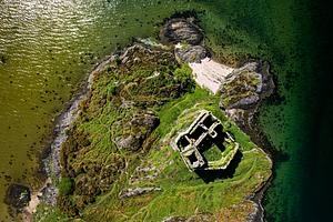 Aerial shot fo the ruined Tioram Castle Ardnamurchan Scotland